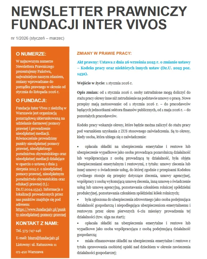Pierwszy z przygotowanych materiałów to Newsletter Prawniczy nr 1/2026. Został ułożony tak, by w jednym miejscu pokazać najważniejsze nowości, które weszły w życie w 2026 roku i mogą mieć znaczenie w zwykłych, codziennych sprawach.
